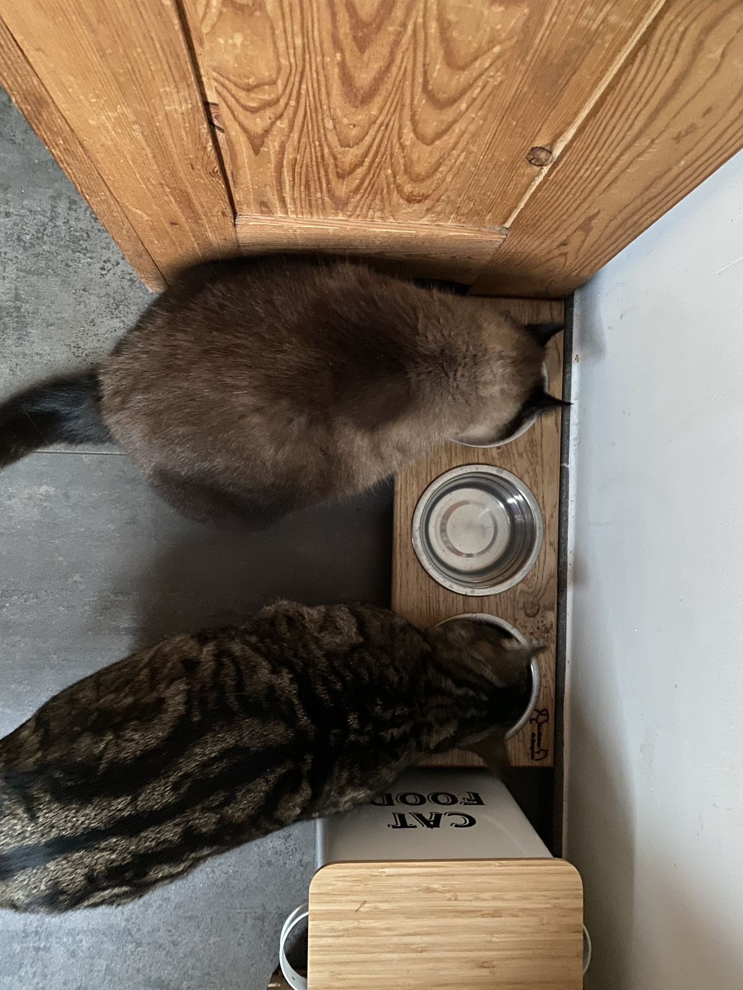 « Nos deux chats se régalent dans leur porte gamelles triple fait sur mesure ! Produit de très bonne qualité. »